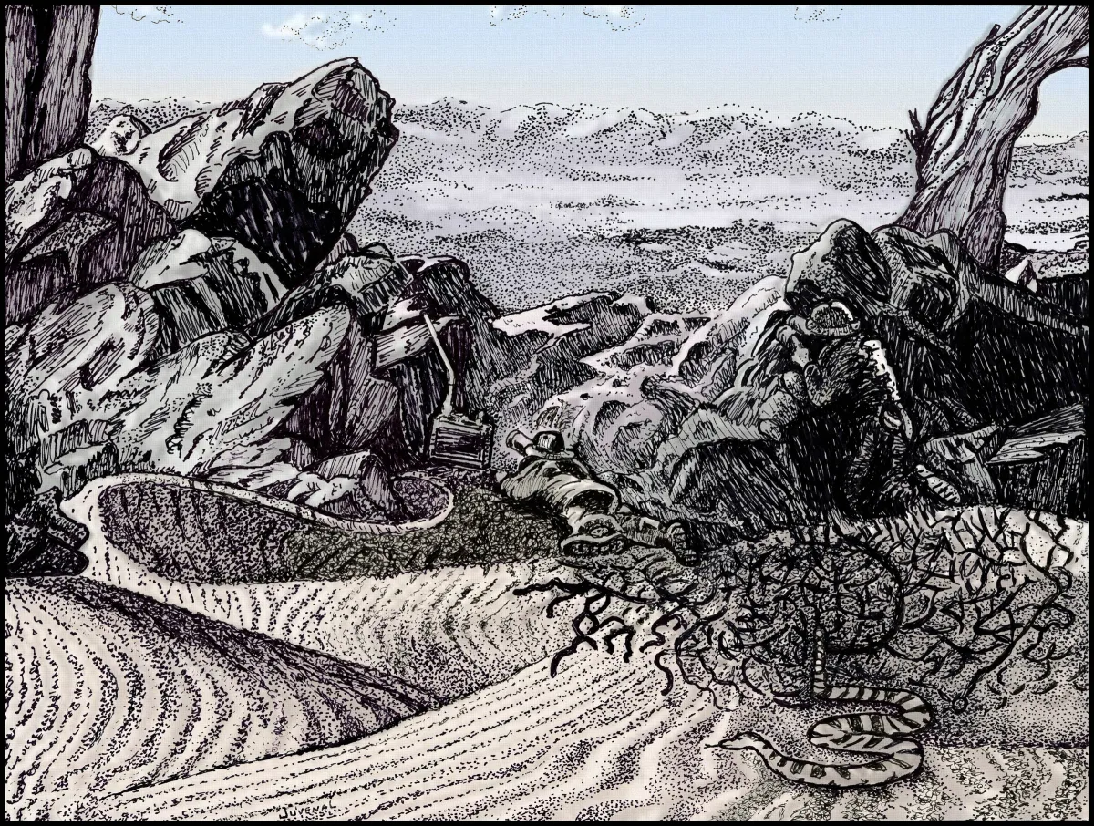 ink drawingdesert landscapemountainssnakestipplinghatchingwildernessRealismBold / GraphicDark / DramaticStorytelling / NarrativeLandscape / NatureAnimals / Wildlife