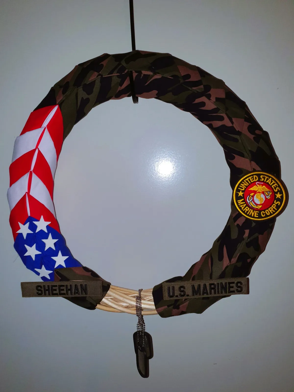 Military wreathU.S. MarinesPatrioticCamouflageDog tagsServiceMemorialRealismStorytelling / NarrativeInspirational / UpliftingPatriotic / Military / FreedomVeteran Story / ServiceHistorical / CulturalSpiritual / Symbolic