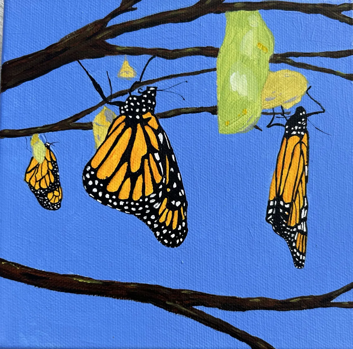Monarch butterflieschrysalistree branchblue skynaturelife cycletransformationRealismStorytelling / NarrativeInspirational / UpliftingBold / GraphicLandscape / NatureAnimals / WildlifeSpiritual / SymbolicHope / Healing / Resilience
