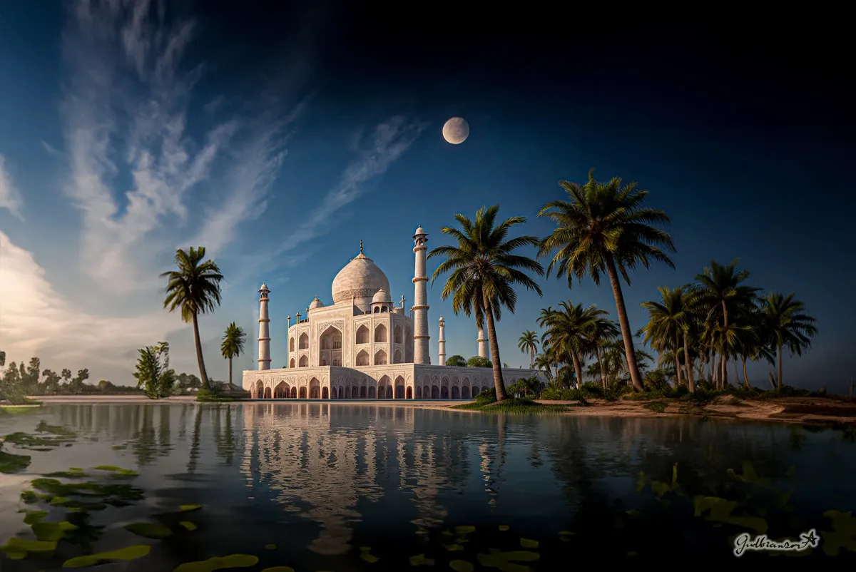 Taj Mahalmoonlightpalm treesreflectionarchitectureIndiahistorical monumentRealismLight / SereneStorytelling / NarrativeInspirational / UpliftingLandscape / NatureSeascape / WaterCity / ArchitectureSpiritual / SymbolicHistorical / Cultural