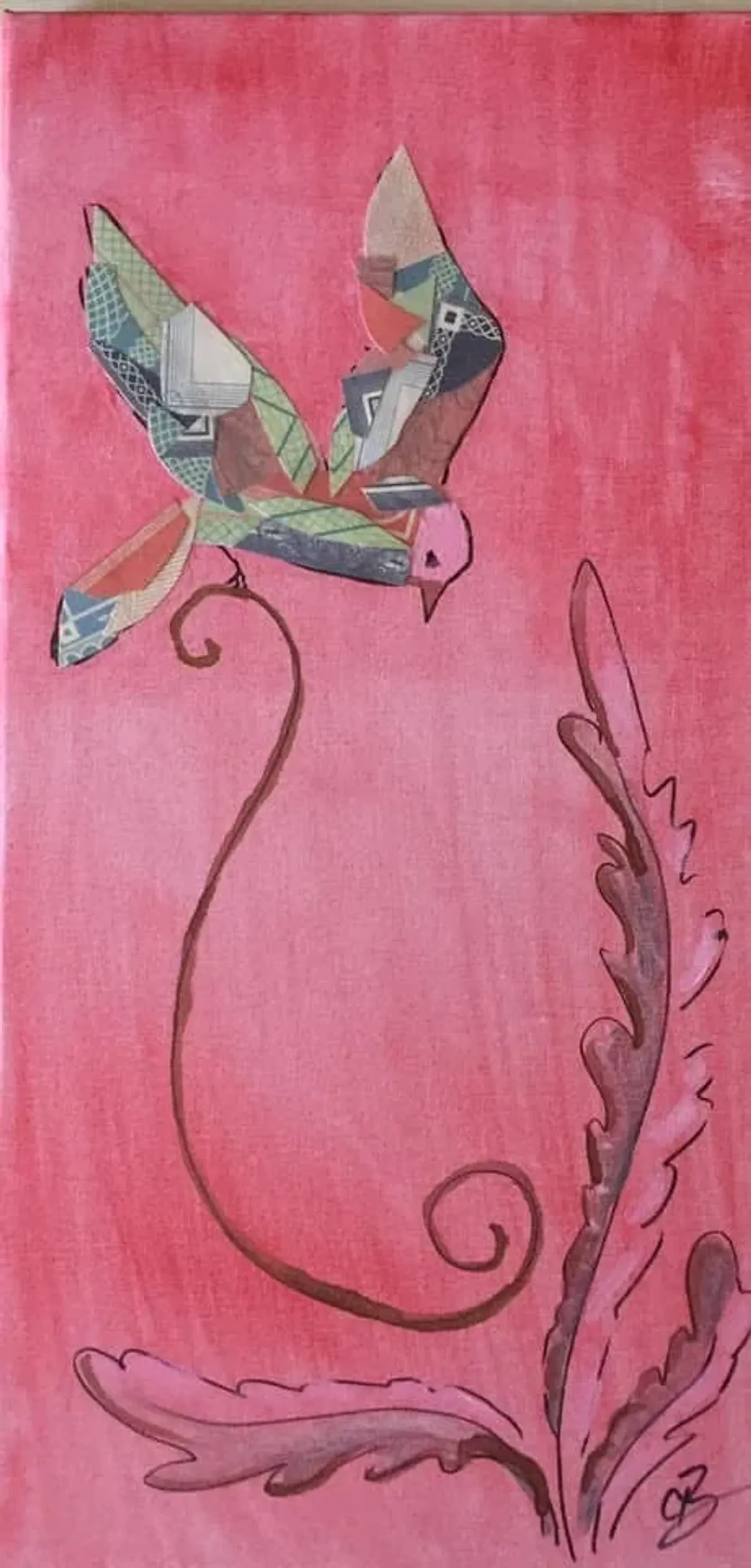 collagebirdpink backgroundmixed mediastylized leavesabstractnature motifAbstractContemporary / ModernStorytelling / NarrativeInspirational / UpliftingAnimals / WildlifeLandscape / NatureAbstract / ConceptualSpiritual / Symbolic
